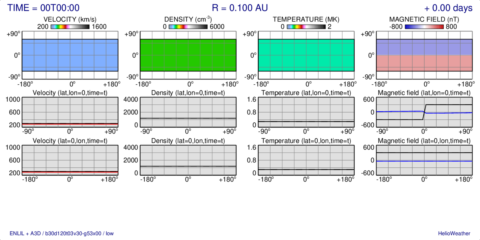 Boundary values of the solar wind velocity, density, temperature, and magnetic field strength (from left to right) at time when a hydrodynamic ejecta passes the boundary (at 0.1 AU):
