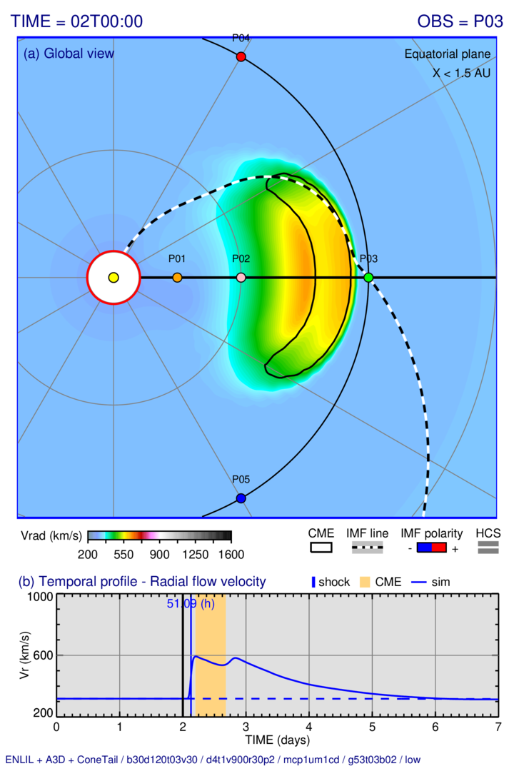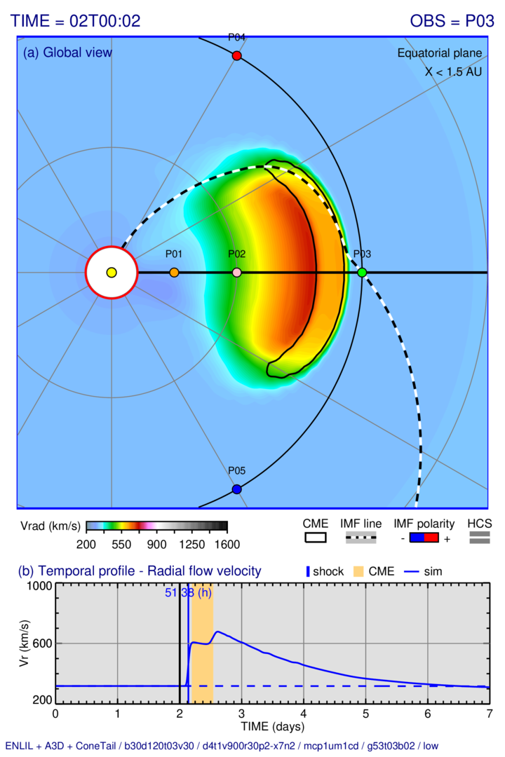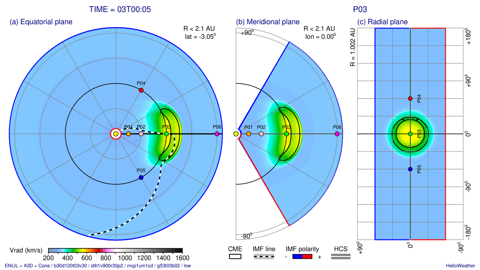 Distribution of the radial solar wind velocity on three slices passing trough the observing point “P03” (at 1 AU) and evolution at this point: