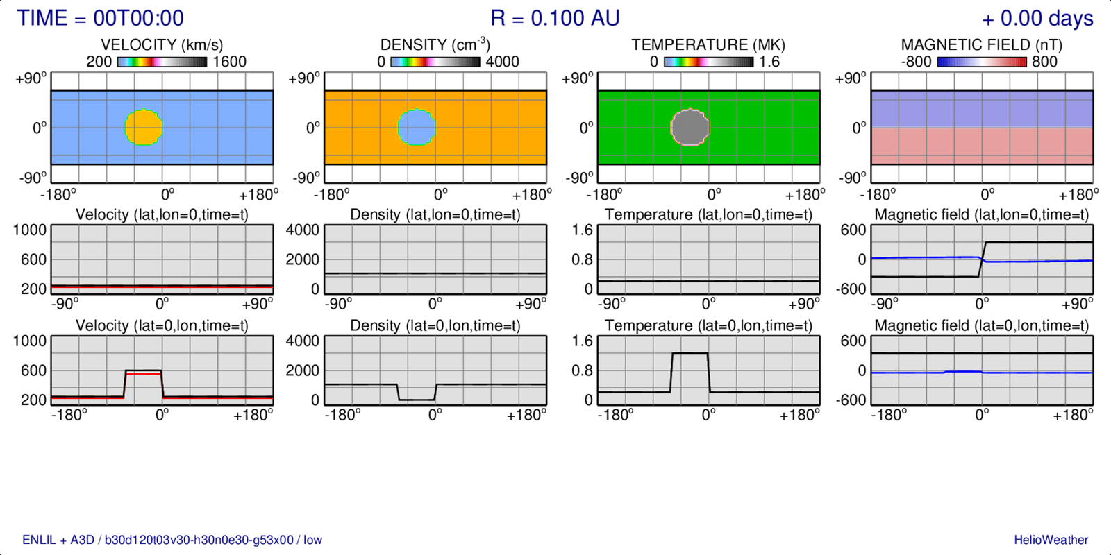 Boundary values of the solar wind velocity, density, temperature, and magnetic field strength (from left to right) at time when a hydrodynamic ejecta passes the boundary (at 0.1 AU):