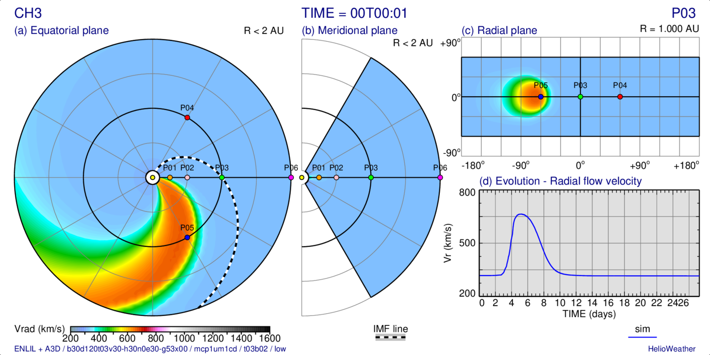 Distribution of the radial solar wind velocity on three slices passing trough the observing point “P03” (at 1 AU) and evolution at this point: