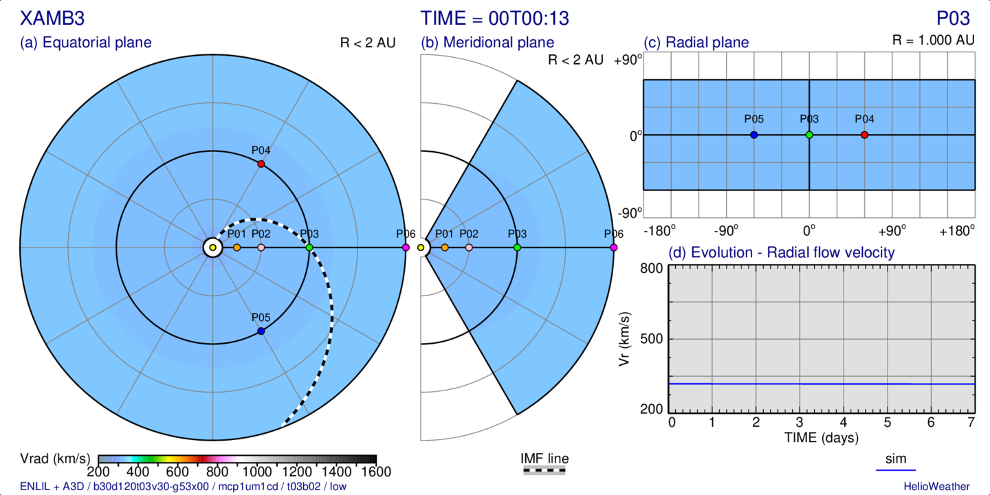 Distribution of the radial solar wind velocity on three slices passing trough the observing point “P03” (at 1 AU) and evolution at this point: