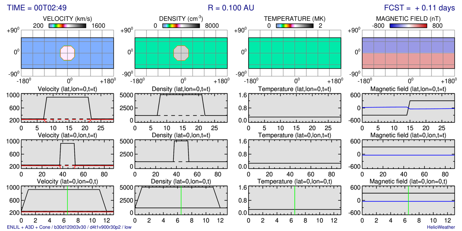 Boundary values of the solar wind velocity, density, temperature, and magnetic field strength (from left to right) at time when a hydrodynamic ejecta passes the boundary (at 0.1 AU):