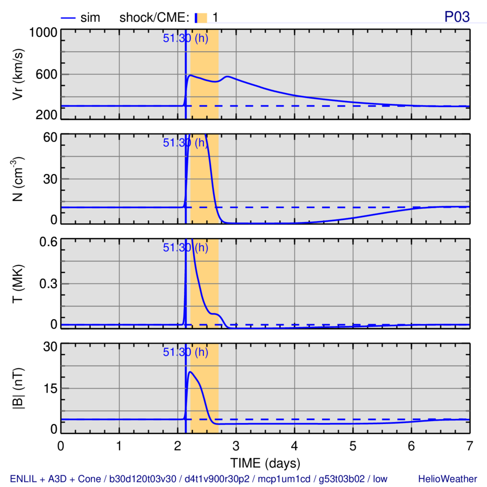 Evolution of the solar wind radial velocity, number density, temperature, and magnetic field strength (from top to bottom) at the observing point “P03”: