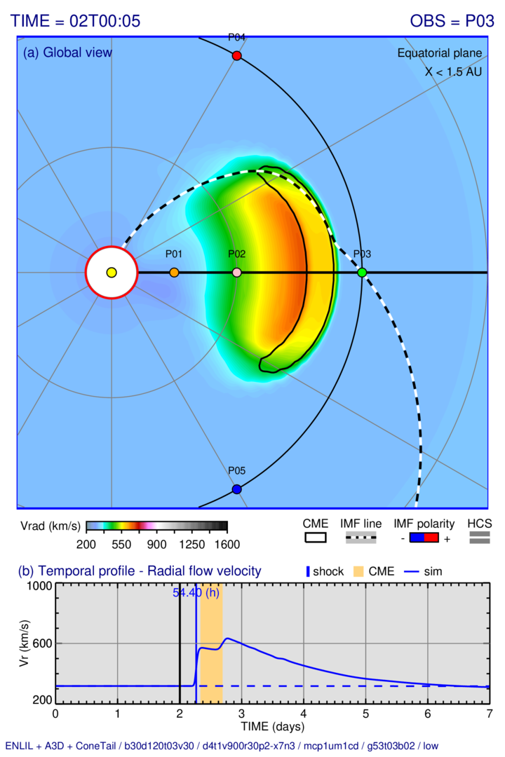Distribution of the radial solar wind velocity on three slices passing trough the observing point “P03” (at 1 AU) and evolution at this point: