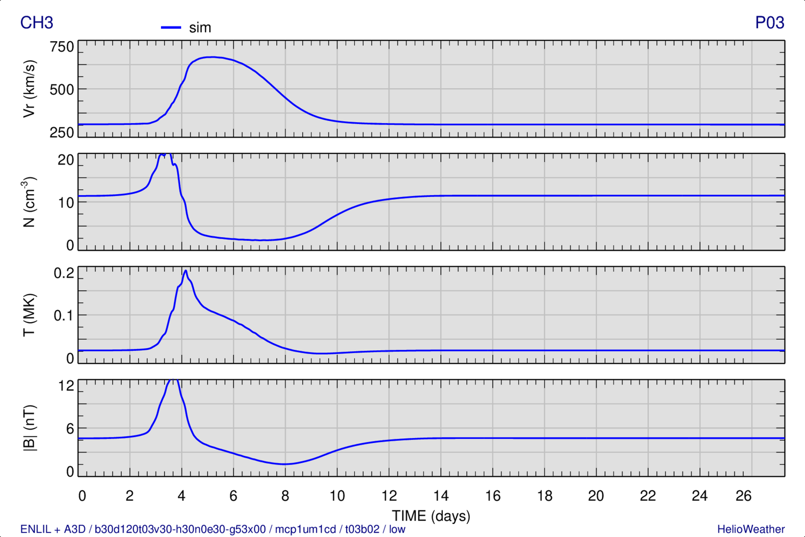 Evolution of the solar wind radial velocity, number density, temperature, and magnetic field strength (from top to bottom) at the observing point “P03”: