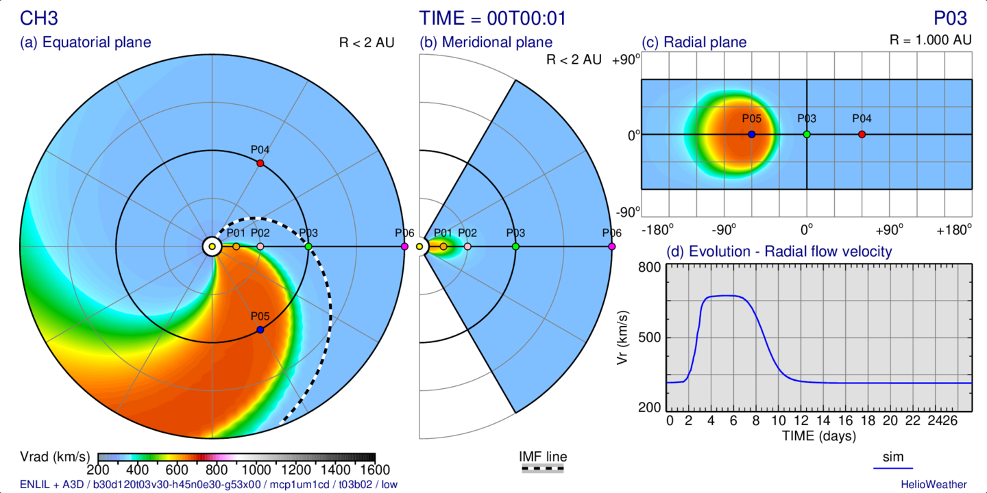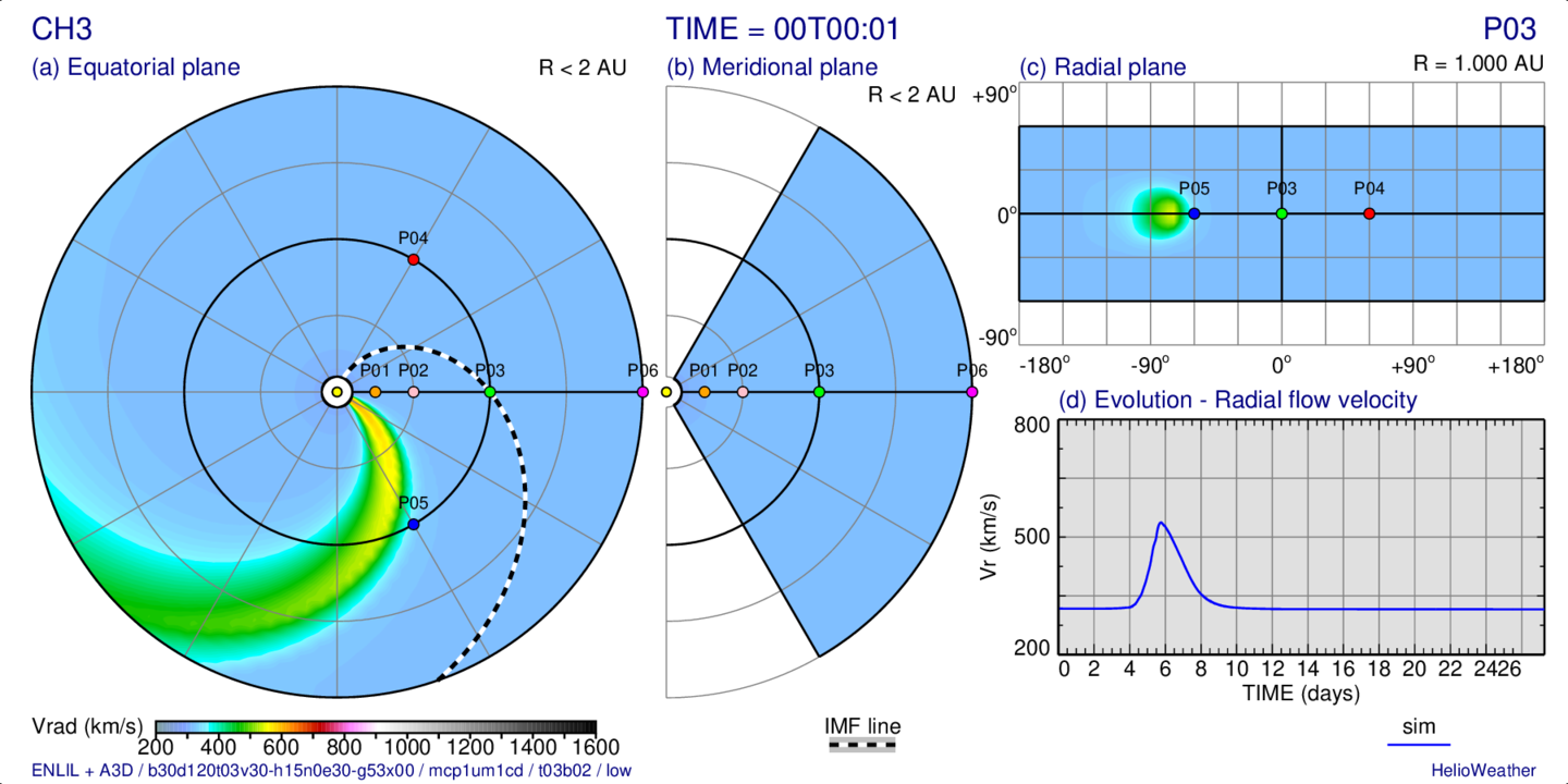 Distribution of the radial solar wind velocity on three slices passing trough the observing point “P03” (at 1 AU) and evolution at this point: