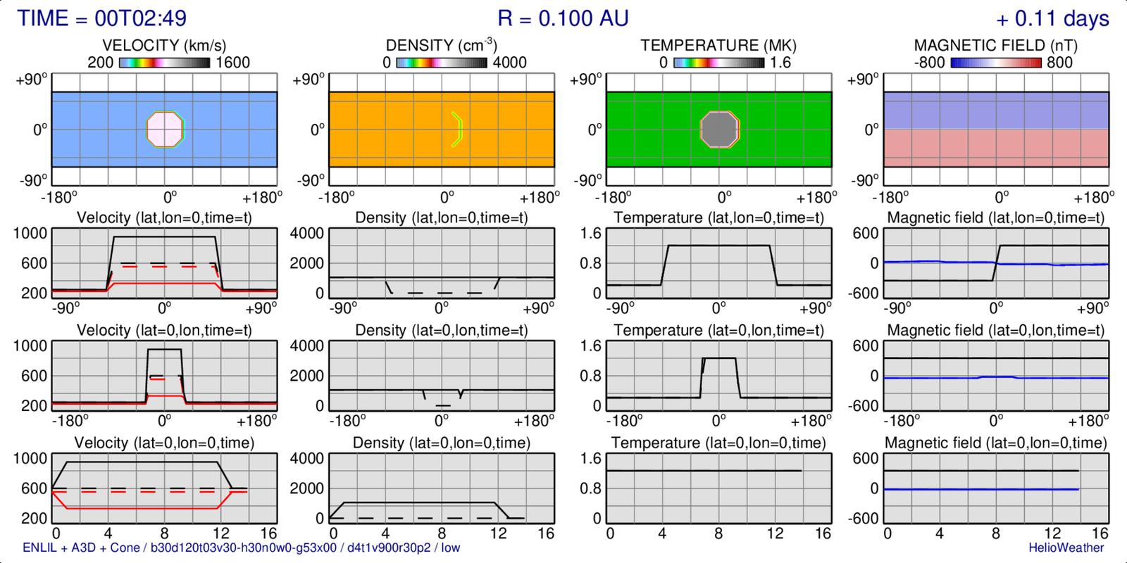 Boundary values of the solar wind velocity, density, temperature, and magnetic field strength (from left to right) at time when a hydrodynamic ejecta passes the boundary (at 0.1 AU):