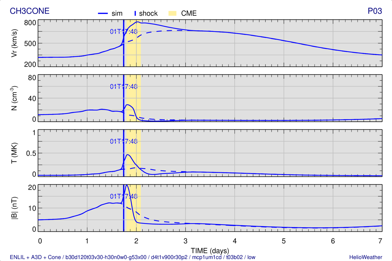 Distribution of the radial solar wind velocity on three slices passing trough the observing point “P03” (at 1 AU) and evolution at this point:
